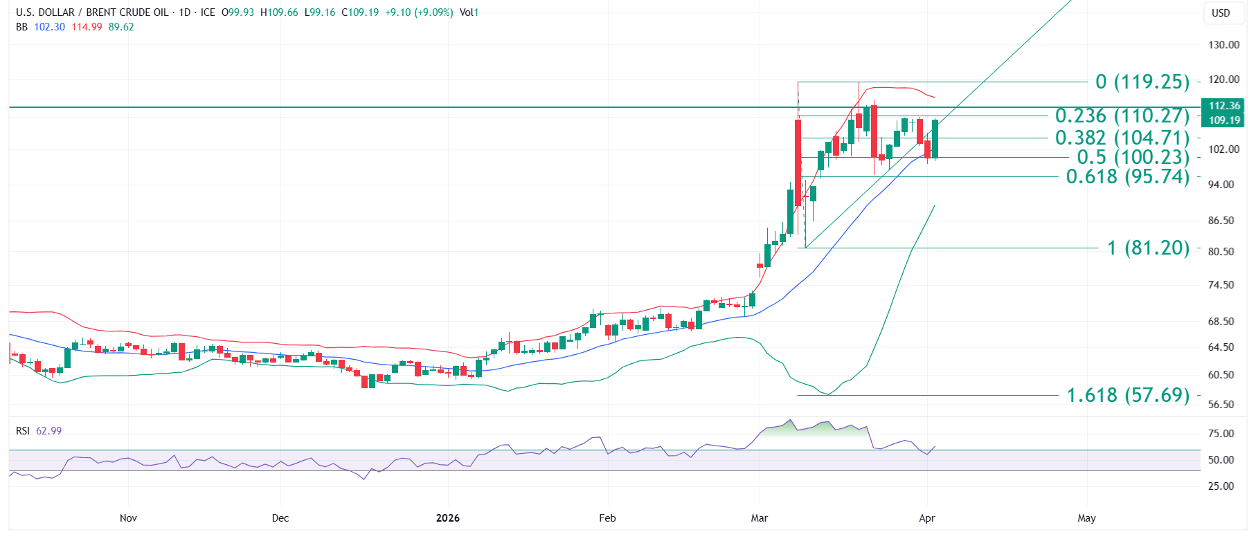 The Brent crude oil price outlook is defined by the approach to the 110 resistance zone. The 104.71 level (Fibonacci 0.382) may transition from resistance to support, while the uptrend trendline provides dynamic support. This energy market technical analysis identifies the 102.30 to 104.71 zone as the critical support range that must hold for the bullish structure to remain intact.